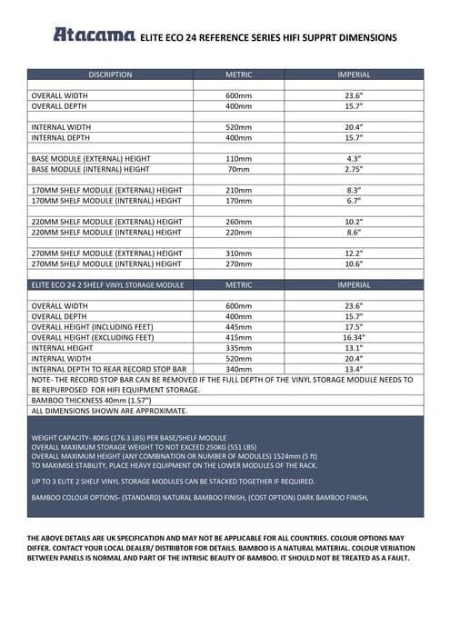The Elite Eco 24 Reference can support hifi components up to and including 80kg (176 lbs) per module, or a maximum completely assembled rack capacity of 250Kg (551 lbs), whichever is achieved first.