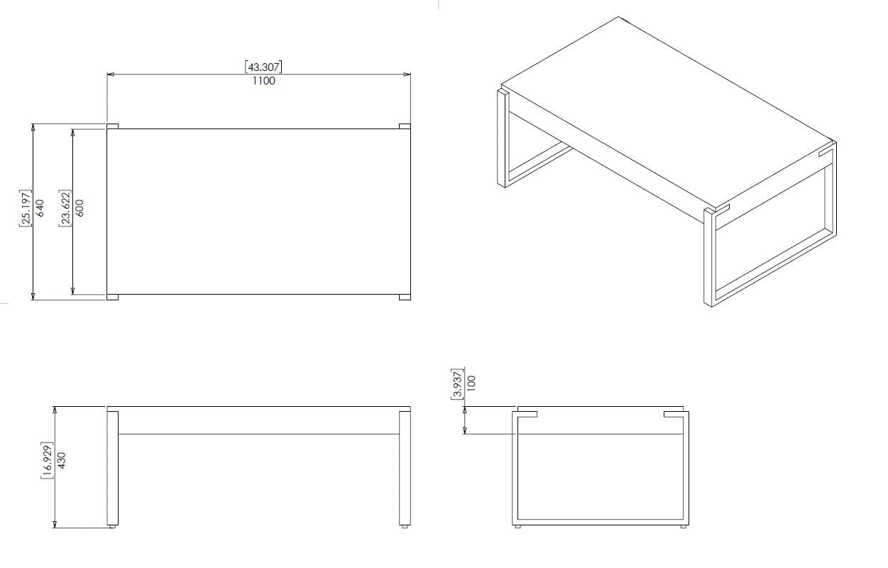 - L 110cm (43.3in) D 64cm (25.1in) H 43cm (16.9in).