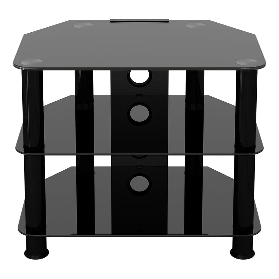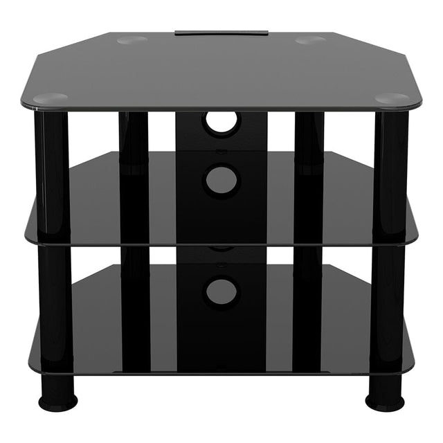 A super easy to construct, contemporary and versatile solution for your home entertainment needs. The black or clear tempered safety glass and durable black or chrome legs modernize any space while the angled corners save valuable space when placed into a corner of your room. Arrange your various AV components on the middle and bottom shelves.