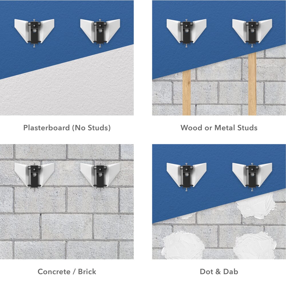 Includes TV fixings for most TV models, plus wall fixings for these surfaces (or any combination): Plasterboard, Wood Studs, Metal Studs, Brick, Concrete, Dot & Dab
