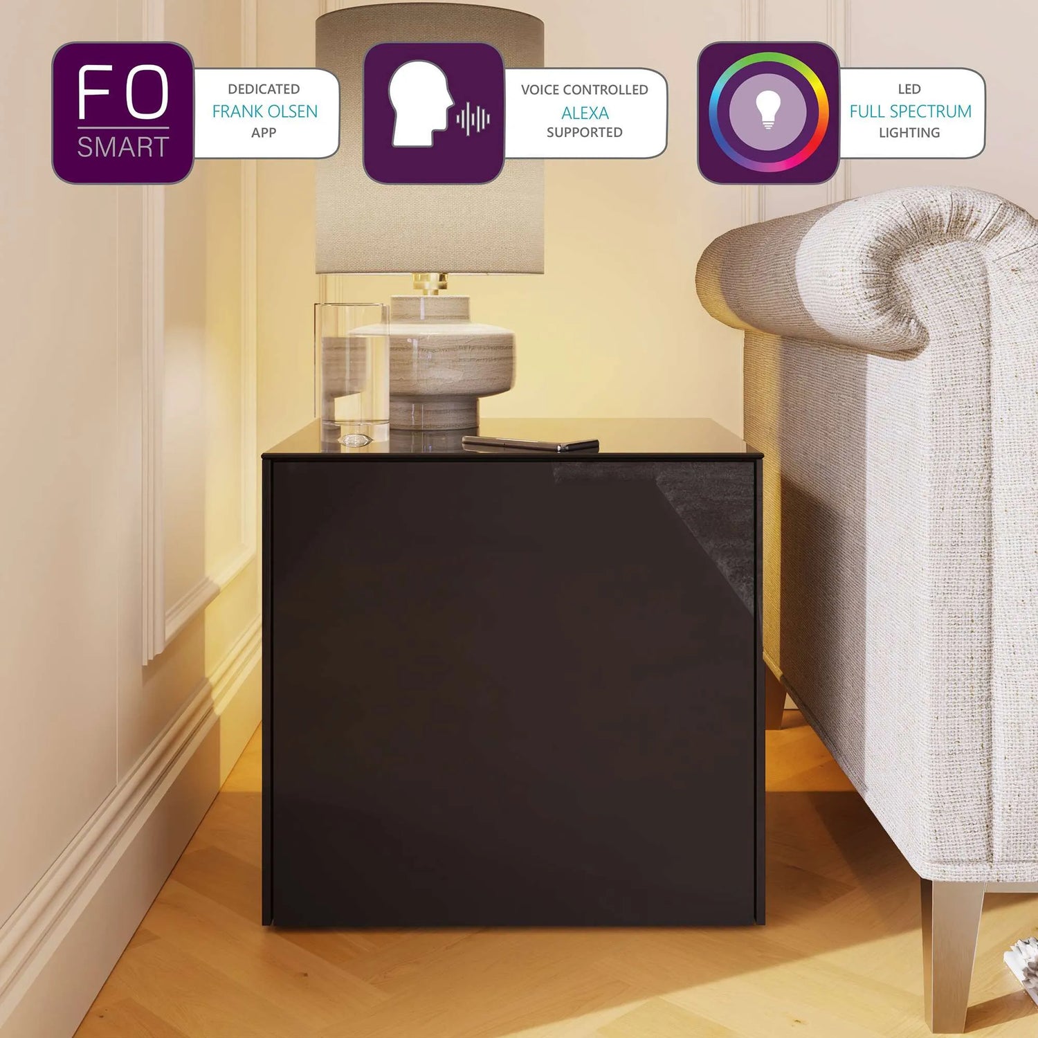 - LED rear mood lighting, full colour spectrum, controlled either by the free Frank Olsen Smart app or by voice command with Amazon Alexa. The lighting can even be set remotely over wifi via the app to come on or off at required times. Change the lighting to change the mood. Ambient, romantic, subtle or flashing and changing colour for fun.