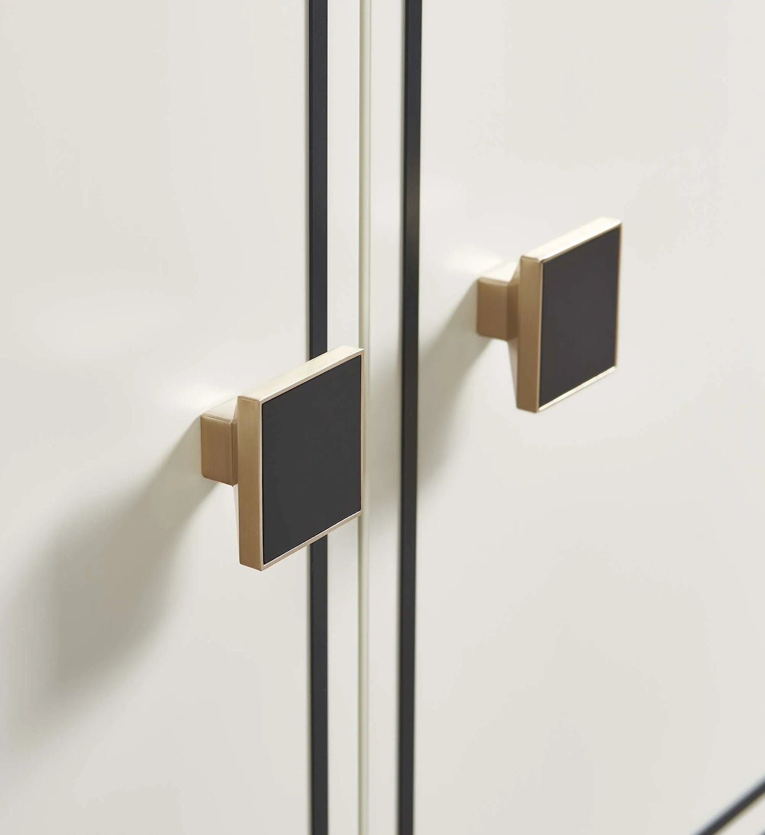 - Square handles in warm metallic and black complete the look with a modern edge.