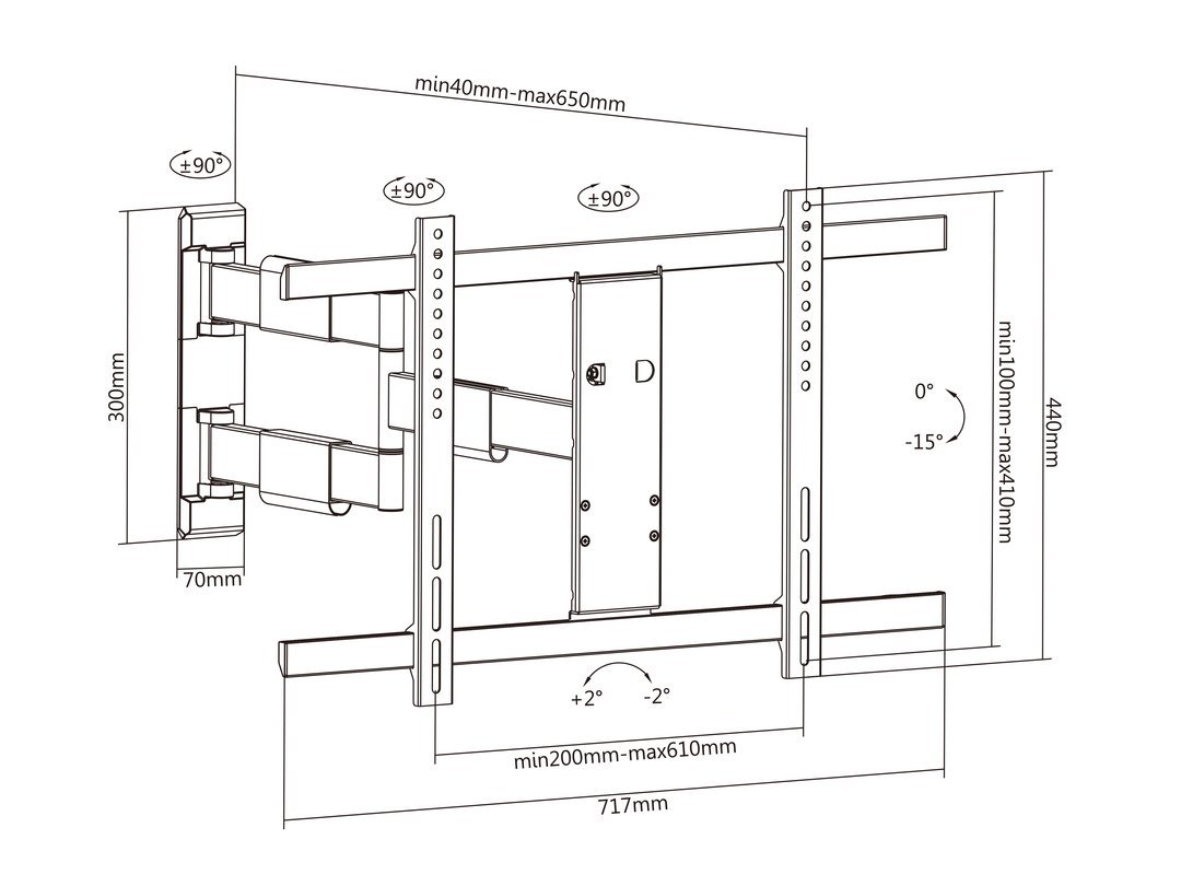 - VESA standard: 200x200, 400x200, 300x300, 400x400, 600x400 mm