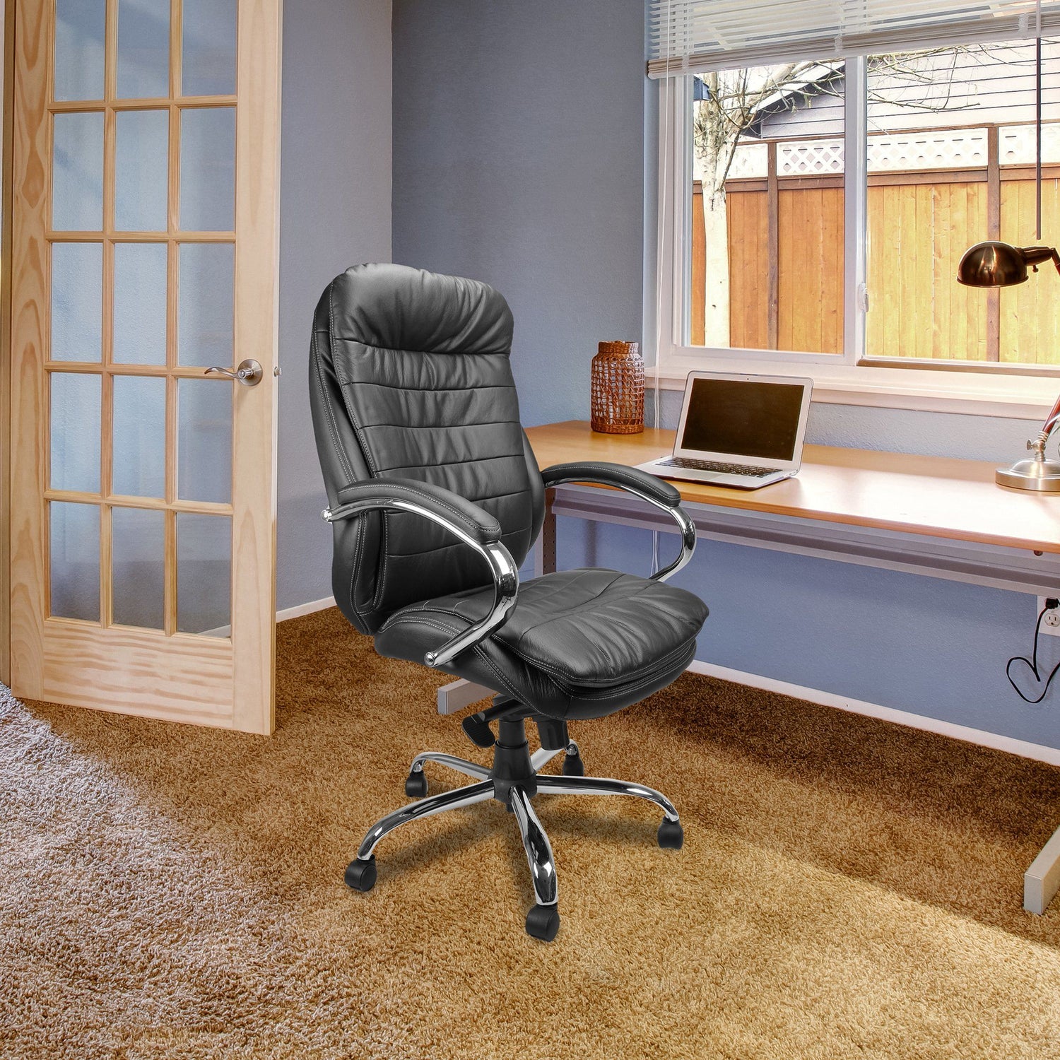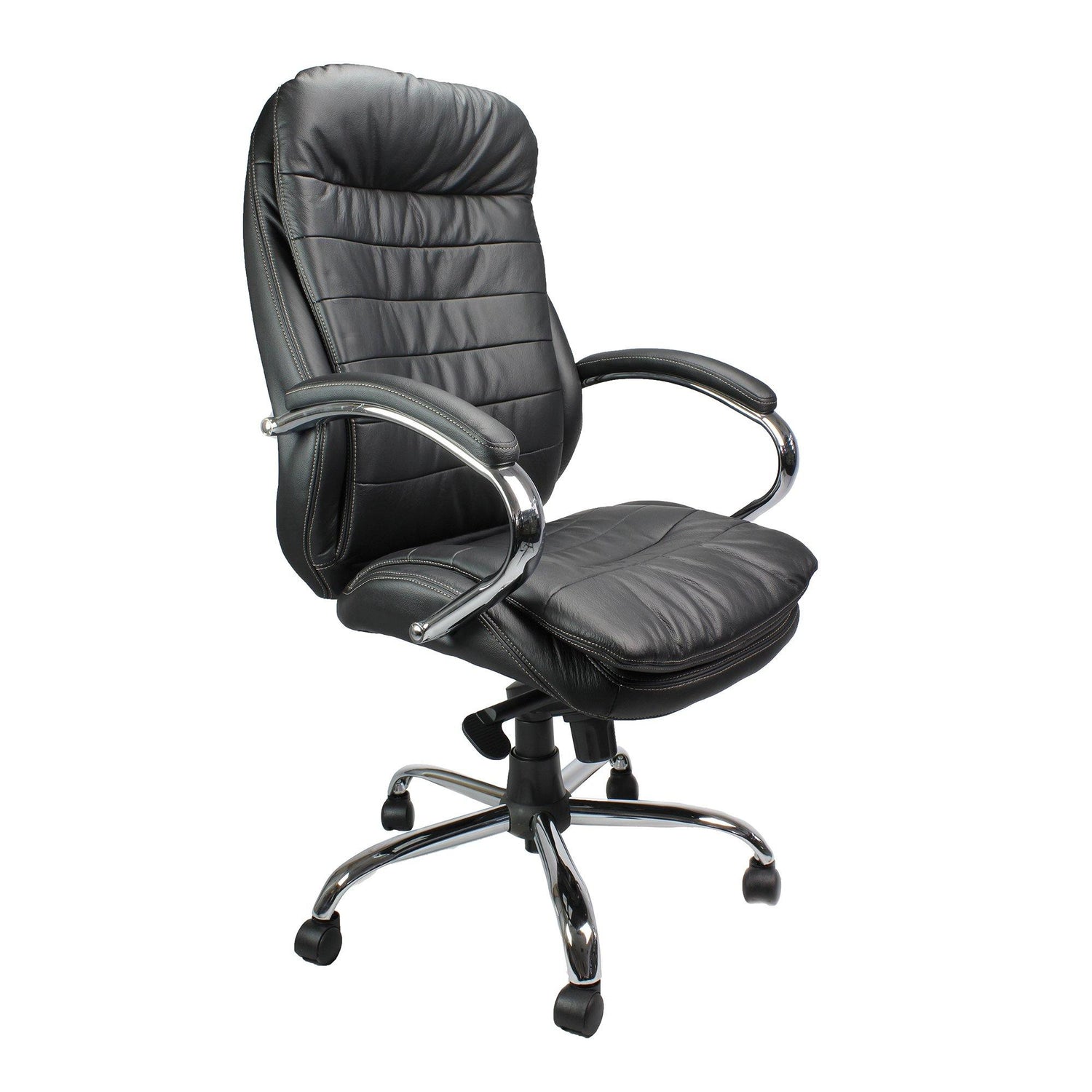 This high back executive armchair leaves little to desire. It is upholstered with plush Italian leather facing and stylishly finished with detailed stitching. The generously proportioned seat with slight waterfall front and backrest with sculptured lumbar and spine support are complemented with matching padded and upholstered armrests. A synchronous chair mechanism, easy seat height adjustment via a sturdy gas lift, knee tilt adjustment and tension control - adjustable to suit the user's weight and lockable in the upright position is finished with a beautifully polished chrome 5 star base and matching integrated arms.
