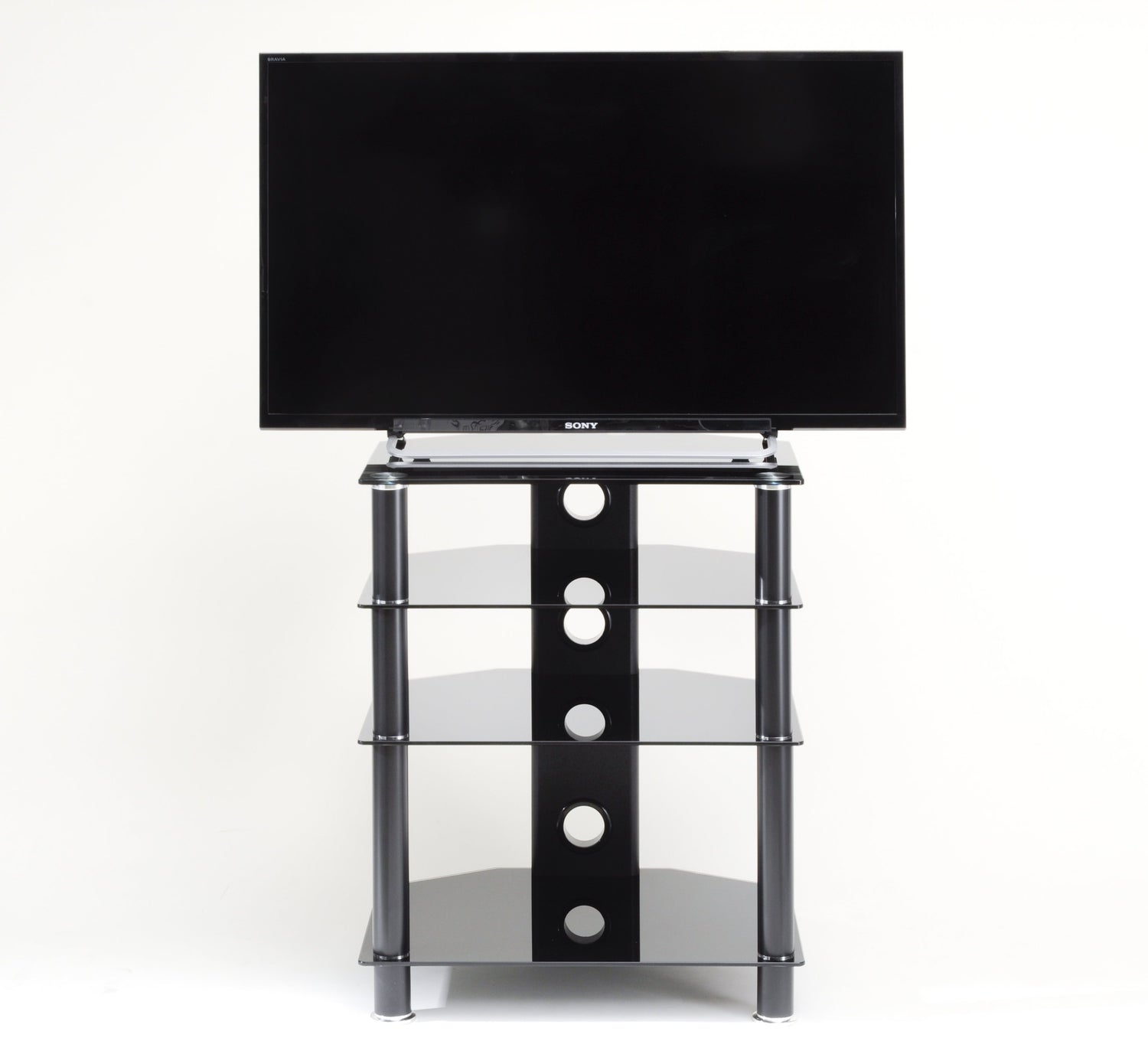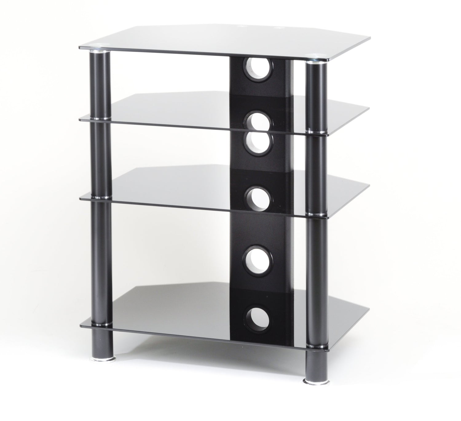 Stylish 4 Shelf Hi-Fi Rack with black legs and black glass. Cable management at the rear ensures cables are kept hidden and tidy. This unit is simple and quick to assemble.
