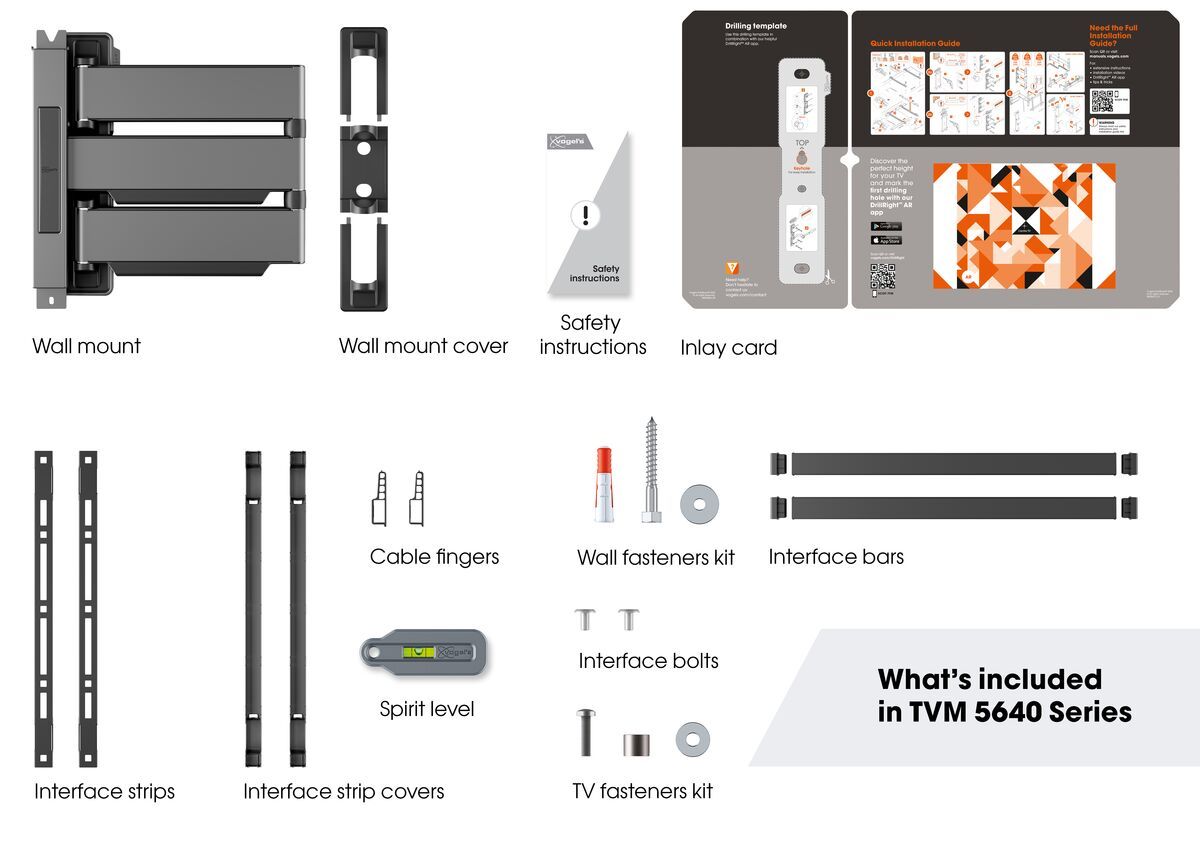 - What's in the box - Wall mount, Wall mounting kit with fischer® Duo Power plugs, TV fasteners kit, Spirit level, Quick Installation Guide, DrillRight™ AR app Drilling template