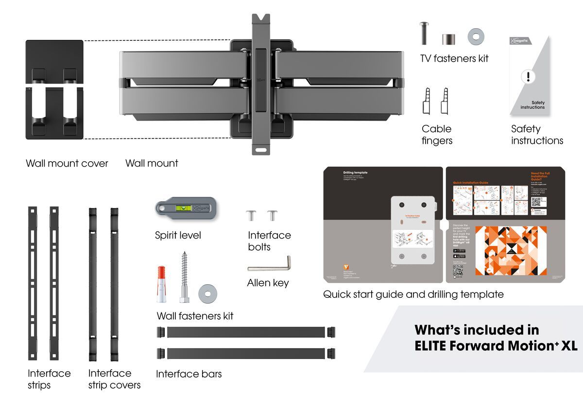 • What's in the box - Wall mount, Wall mounting kit with fischer® Duo Power plugs, TV fasteners kit, Spirit level, Quick Installation Guide, DrillRight™ AR app Drilling template